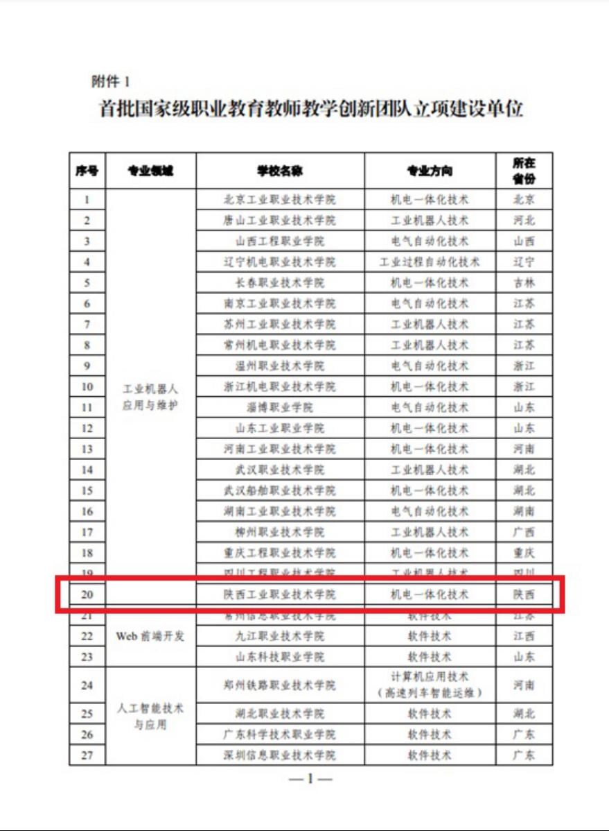 2019年7月,按照教育部“全国职业院校教师教学创新团队”建设工作安排,我院积极筹备申报工作。经过校内遴选、学院申报、省教育厅初评、教育部评审等环节,“机电一体化技术”教学创新团队通过评审。全国首批国家级职业教育教师教学创新团队立项建设单位共120个,陕西省共3所高职院校入选。