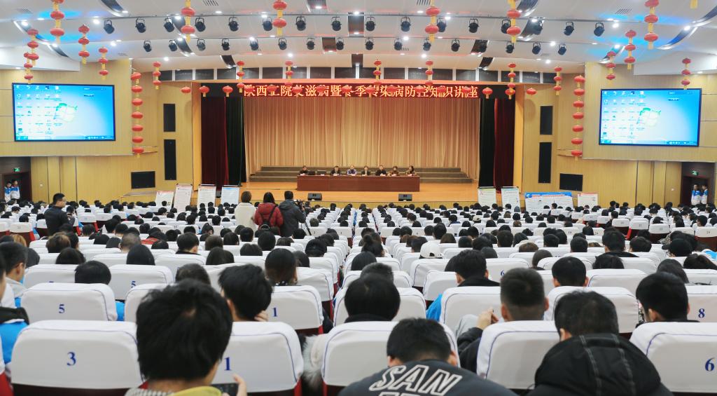 12月11日下午,我院联合咸阳市第一人民医院,在明德堂礼堂举办艾滋病暨冬季传染病防控知识专题讲座。本次讲座咸阳市第一人民医院选派了泌尿病院院长兼泌尿第一病区主任、主任医师燕群峰和预防保健科科长、主任护师荣爱琴前来为我院师生做精彩讲授。学院副院长刘清、第一人民医院副院长鱼丽萍、学生处副处长杨修国以及学生辅导员、公寓管理员、学生代表1000余人到场聆听,后勤处副处长韩二豹主持活动。咸阳电视台对讲座进行了全程采访报道。