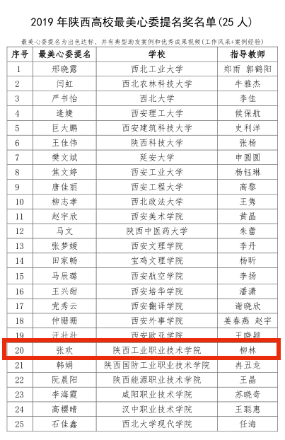 为贯彻教育部《高等学校学生心理健康教育指导纲要》及省教工委心理育人工作部署,加强高校心理委员工作,推展心理助友优秀成果,陕西省高校心理健康教育研究会开展了“2019年陕西省高校最美心委和百佳心委推选活动”。我院材料工程学院质检1801班郑梦妍荣获“最美心委称号奖”,土木工程学院造价1802班张欢荣获“最美心委提名奖”,航空工程学院机器人1802班杨朝阳、土木工程学院工程造价1808班叶启园、财经与旅游学院会计1804班南婷荣获“百佳心委荣誉奖”;柳林老师获优秀指导老师奖。