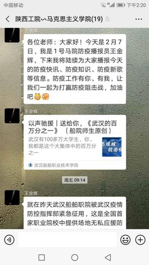 开展“抗疫思政专题分享”:马院防疫工作组成员紧密结合思政课程建设需要,积极遴选思政教育特色鲜明的相关内容,适时分享于马院工作微信群,思政课教师结合专题展开了热烈的讨论和互动,保证疫情防控期间学习、教育不断线。