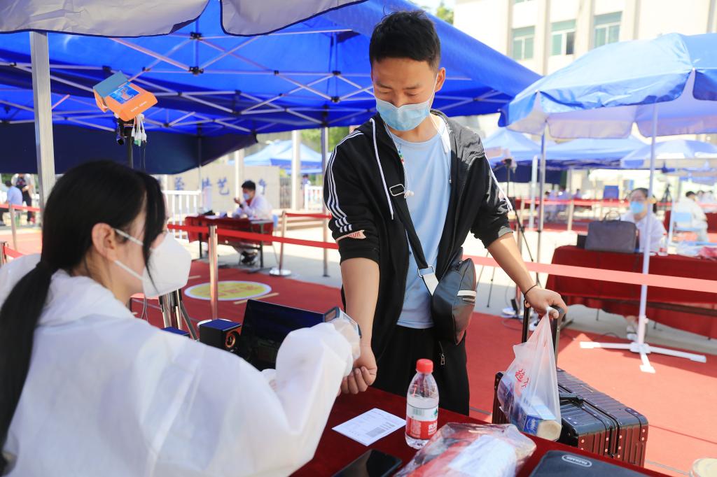 多重检测,重细节保障健康安全。学生入校检测是做好防疫工作的第一道安全屏障。早上七点整,各二级学院教师、学生志愿者和保卫处执勤人员,已经身着防疫服、背好消毒桶、手持测温枪到达岗位。在校门口设置的学生通道前,返校学生间隔1米以上有序排队进入行李消杀区域,待出示学生证、健康码,再经测量体温正常后,进入各二级学院登记处进行信息登记,提交《健康承诺书》,领取备用口罩和防疫知识手册。
