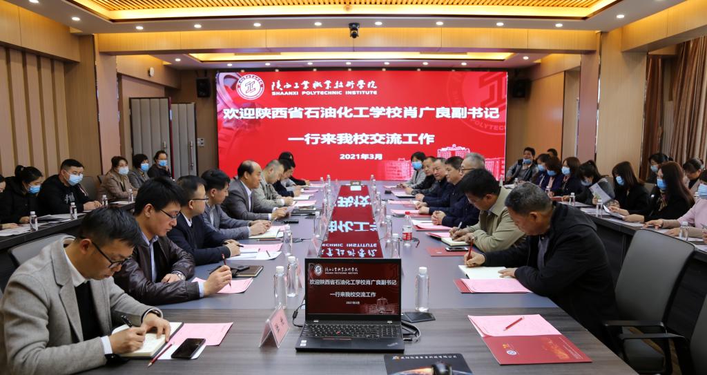 梅院长对肖广良副书记一行的到来表示欢迎,在观看完学院宣传片后,梅院长从学校规模、办学模式、校企合作、招生就业等方面做了简要说明。肖广良副书记对我校的热情接待表示感谢,对我校取得的成绩表示赞赏,并简要介绍了陕西省石油化工学校的基本情况,希望今后两校加强交流,进一步加强合作办学。双方相关对口部门就党建、招生就业、学生管理、校企融合等方面的经验做法进行了深入的交流。