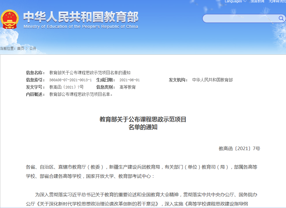 教育部公布课程思政示范项目名单链接: