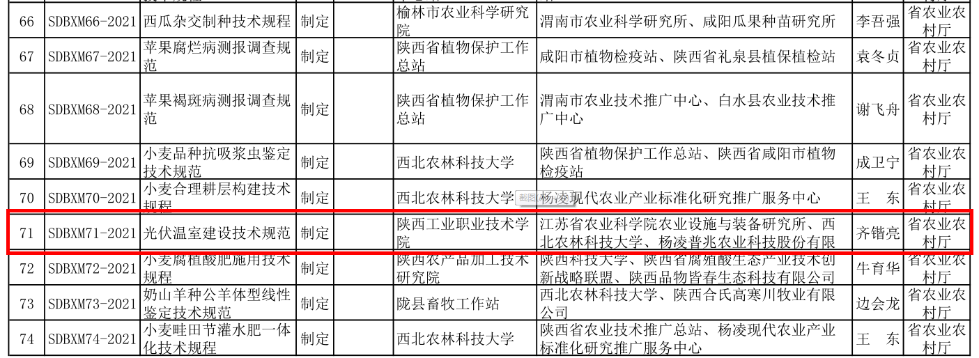 近日,陕西省市场监督管理局《关于下达2021年第一批地方标准计划的函》(陕市监函〔2021〕424号)公布了2021年第一批陕西省地方标准计划项目,我校电气工程学院齐锴亮博士负责的“光伏温室建设技术规范”项目获批立项,计划号:SDBXM71-2021。