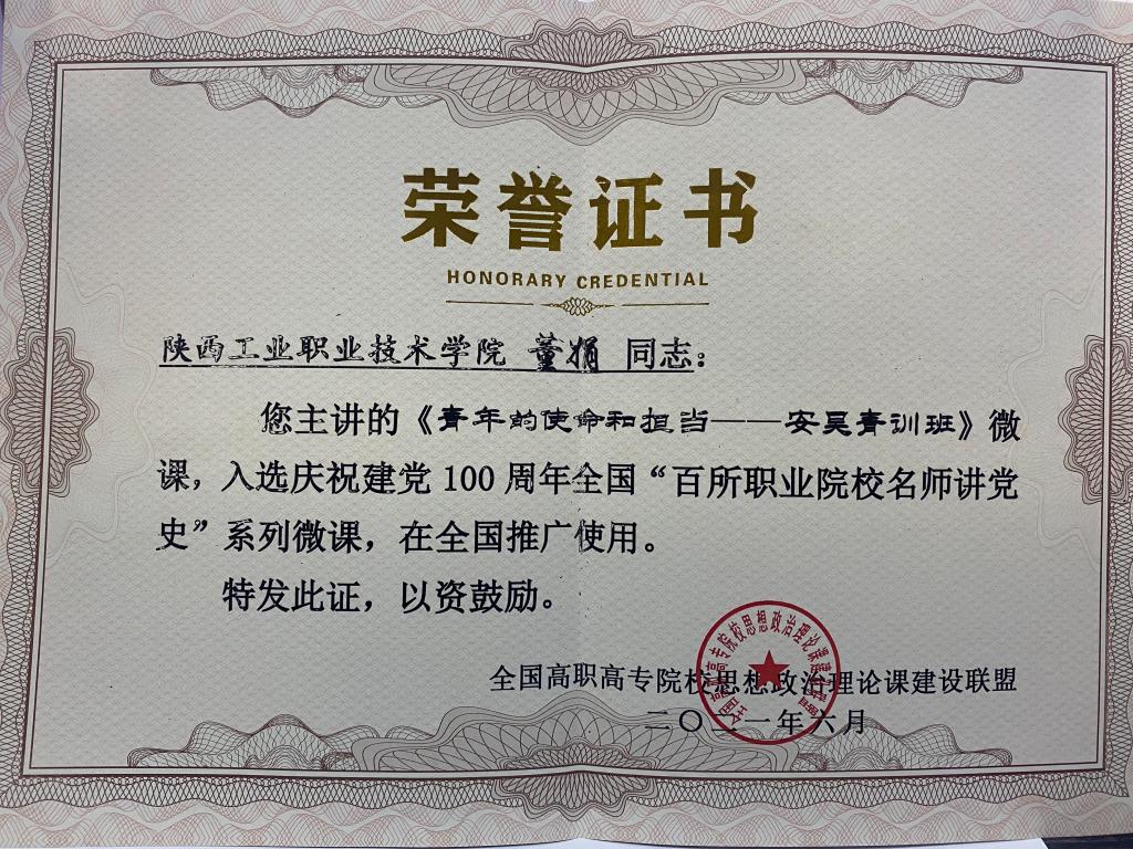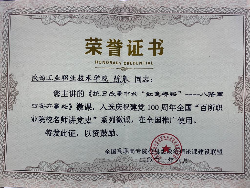 会上,我校报送的原创视频作品《青春匠心》荣获全国高职高专院校“百城百校百万师生喜迎建党100周年”红色歌曲接力活动一等奖;我校马院教师陈晨和董娟主讲的微课《抗日战争中的红色桥梁——八路军西安办事处》和《青年的使命和担当——安吴青训班》入选庆祝建党100周年全国“百所职业院校名师讲党课”系列微课,在全国推广使用。