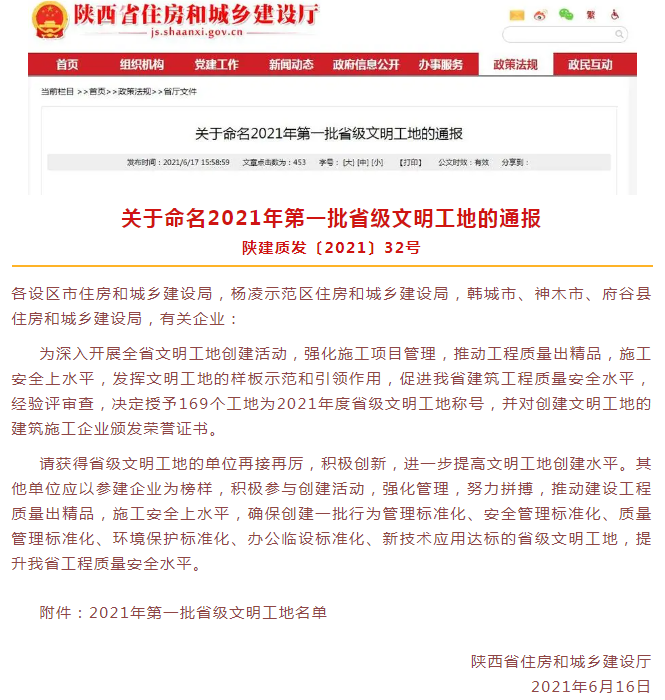 近日,据陕西省住房和城乡建设厅《关于命名2021年第一批省级文明工地的通报》(陕建质发〔2021〕32号),由陕西建工集团股份有限公司承建、陕西省工程监理有限责任公司监理的我校新校区一期一批EPC总承包项目248744.8㎡喜获2021年第一批省级文明工地。