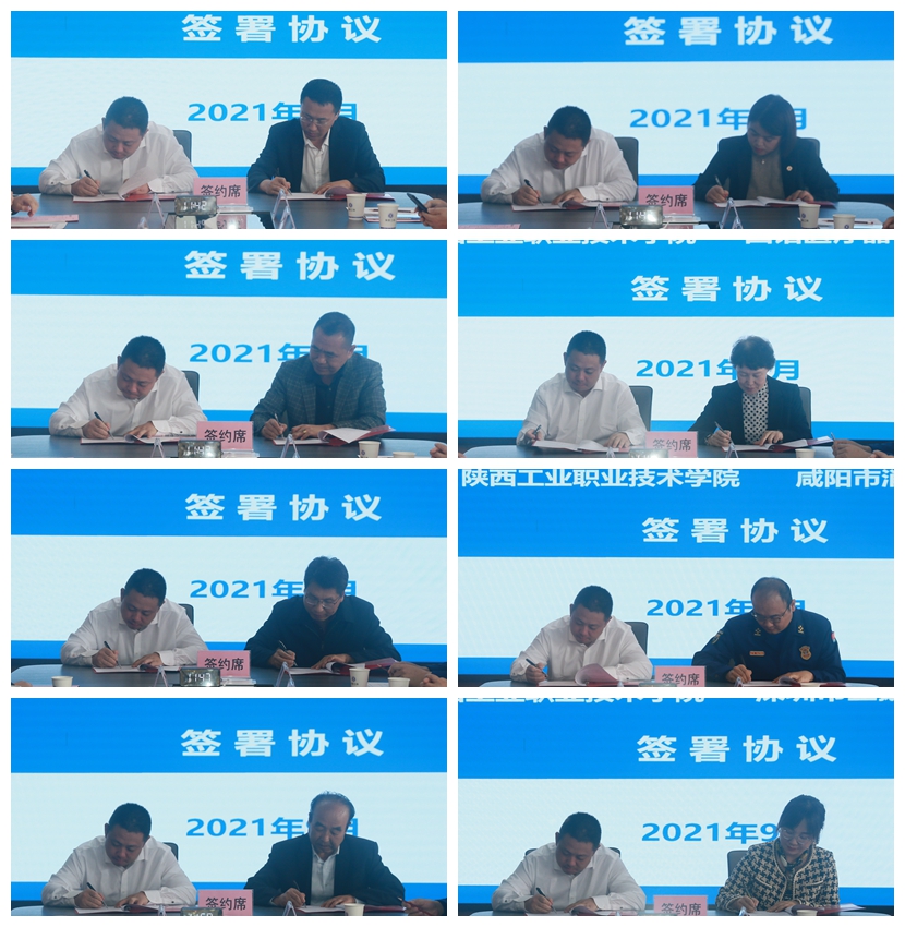 9月28日,咸阳隆基乐叶光伏科技有限公司、陕西天士力医药物流有限公司、陕西咸阳杜克普服装有限公司、西诺医疗器械集团有限公司、陕西省崔家沟监狱、咸阳市消防救援支队、陕西帛宇纺织有限公司和深圳市企鹅网络科技有限公司等8家企事业单位齐聚我校,参加陕西工院技能提升行动培训项目集中签约仪式,共同助推咸阳市职业技能提升行动快速发展。