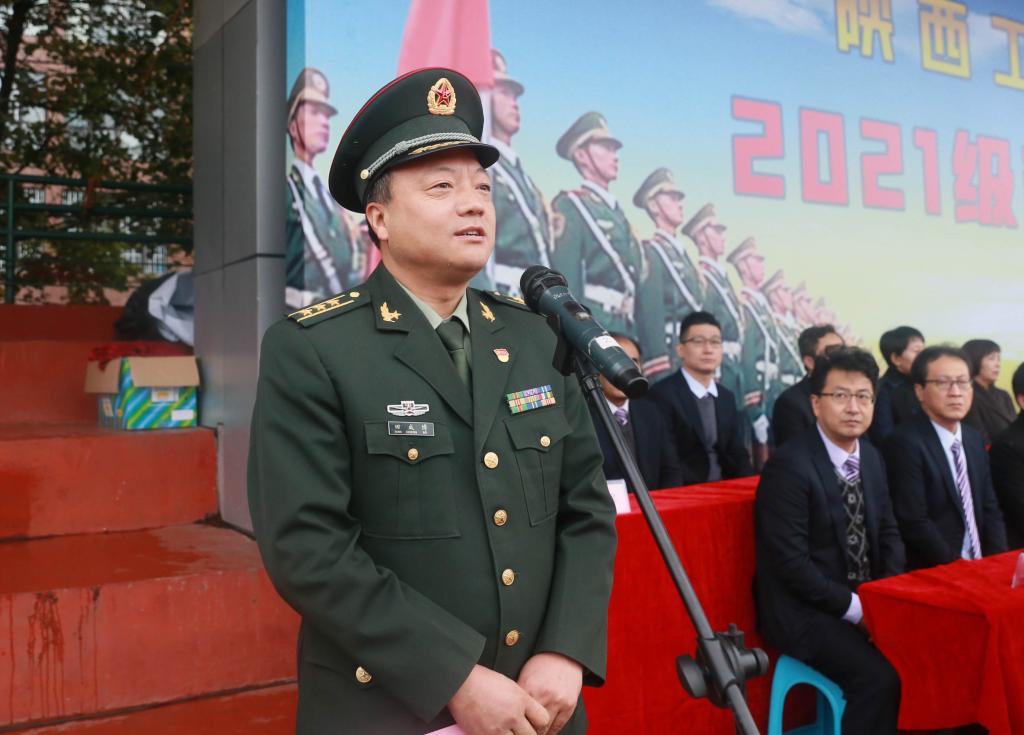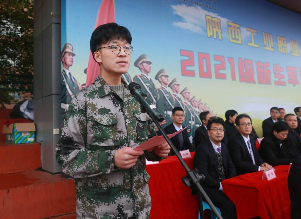 咸阳军分区渭城区武装部部长田成博希望同学们珍惜军训机会,在接下来的军训中,服从命令,听从指挥,磨练心志,为以后成为祖国的栋梁之材打下坚实的基础;希望教官们科学组训、正规施训,严格要求,确保质量,真正使参训的同学们受益匪浅,终生难忘。机制2109班梁国鑫代表全体参训新生表态,将严明纪律、服从命令、听从指挥、刻苦训练,在训练中展现出工院学子的良好精神风貌。