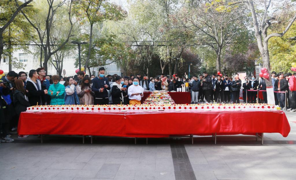 本次美食节共推出川、浙、闽、新等多种地方风味的中式菜肴、特色小吃、中西式糕点等二十余种,还制作了6*0.8米的巨型蛋糕和多种时令水果,为师生带来了一场美食盛宴,也为我校七十一华诞送上了最温暖的冬日祝福。活动现场同学们热情参与,每个人脸上都洋溢着喜悦的笑容,为餐饮中心办好美食节和改进服务、提升管理服务水平增添了信心和力量。