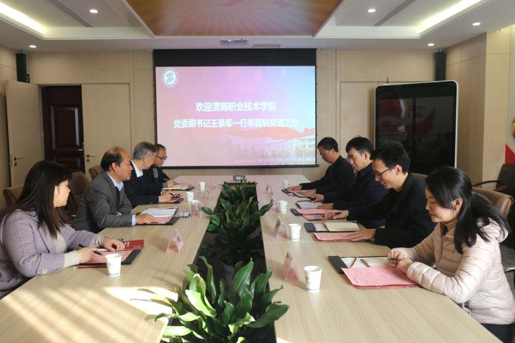 11月18日上午,渭南职业技术学院党委副书记王录军、教务处处长魏恒、师范学院院长兼美育中心主任郭楚伟、美育中心副主任杨文华一行4人来我校交流美育工作。我校副校长梅创社、美育部部长付胜利、教务处副处长舒蕾、美育部办公室主任毛建芳在崇文楼十楼第三会议室与来访嘉宾进行座谈交流,会议由副校长梅创社主持。