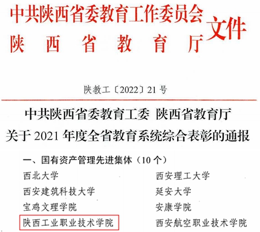 近日,陕西省委教育工委、陕西省教育厅印发了《关于2021年度全省教育系统综合表彰的通报》(陕教工〔2022〕21号),我校荣获“2021年度国有资产管理先进集体”称号。据悉,我校也是陕西省唯一连续三年获得“国有资产管理先进集体”称号的高职院校。