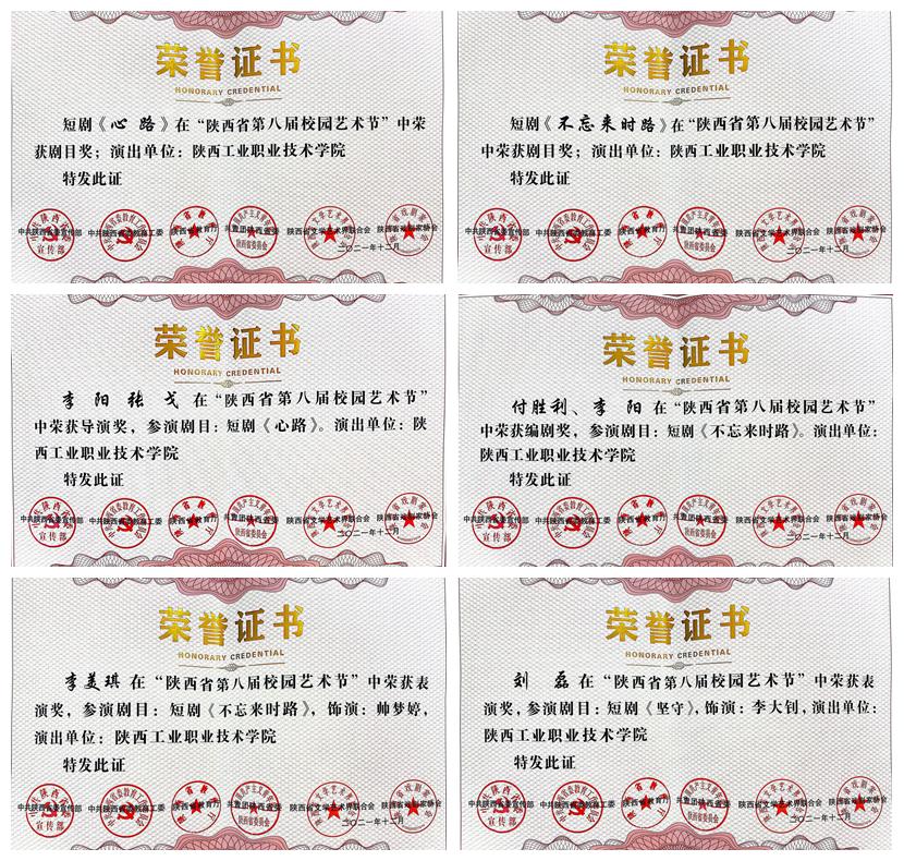 陕西省校园艺术节是陕西高校校园艺术的一次集体展示,充分发挥了戏剧艺术在培养道德情操、提高审美修养方面的特殊功能和潜移默化的育人效果,对促进在校学生德智体美全面发展具有重要意义。本届校园艺术节以“筑梦青春·献礼百年”为主题,全省共20多所高校参加。我校报送的三部作品中,短剧《心路》荣获剧目奖和导演奖,短剧《不忘来时路》荣获剧目奖和编剧奖,短剧《不忘来时路》《坚守》分别荣获表演奖,学校荣获优秀组织奖。