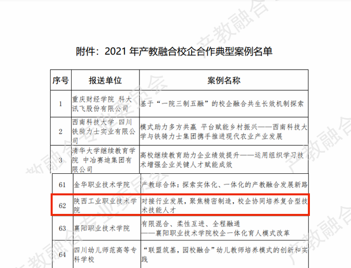 根据教育部《关于征集产教融合校企合作案例的启事》精神,中国教育发展战略学会产教融合专业委员会受教育部委托组织申报和遴选工作,并于近日公布《2021年产教融合校企合作典型案例名单》。我校机械制造与自动化专业群携手北京精雕科技集团联合申报的《对接行业发展,聚焦精密制造,校企协同培养复合型技术技能人才》产教融合案例成功入选,在485个案例中位于前列。