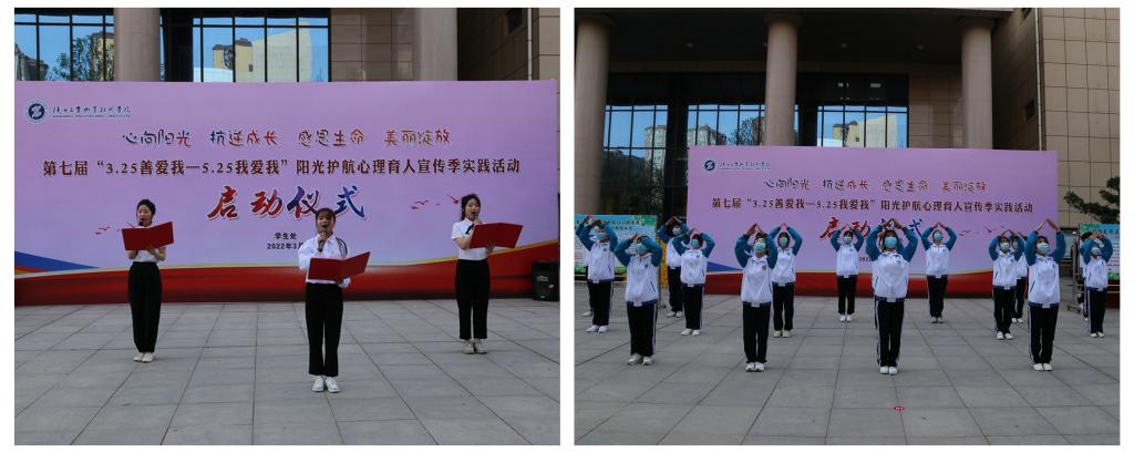 春风和煦,万物复苏。3月28日下午,我校第七届“3.25善爱我—5.25我爱我”阳光护航心理育人宣传季实践活动启动仪式在学校精艺楼前顺利举行。本次活动由学工部主办,首次采用了线上线下相结合的宣传方式。学校党委副书记贺天柱、学工部负责人、各二级学院党总支书记、学工办主任、二级学院心理工作站站长、各班心理委员及心理协会会员代表参加活动。