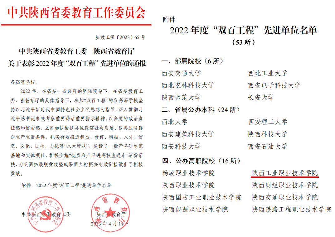 日前,中共陕西省委教育工委、陕西省教育厅下发《关于表彰2022年“双百工程”先进单位的通报》(陕教工函【2023】65号),对全省参加“双百工程”高校进行全面考核并进行表彰,我校获得陕西省2022年度“双百工程”先进单位。