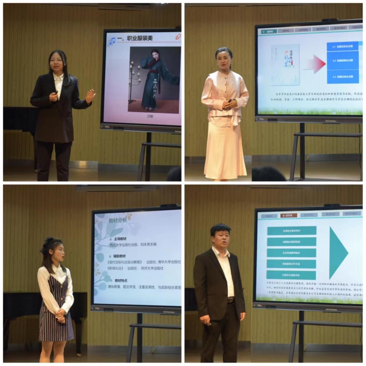 随后,在教学能力展示模块中,教师们分别从如何认识美、欣赏自然美、职业服装美和校园礼仪美、职场礼仪美、成立修身美等内容展示《美育与大学生艺术素养》《大学生礼仪美》课程的教学内容。