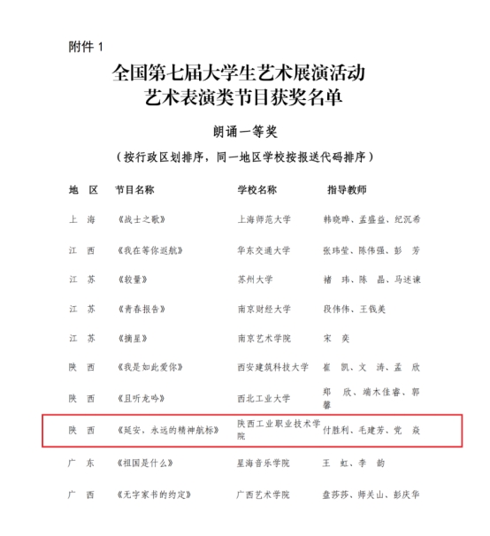 6月13日晚,我校原创朗诵作品《延安,永远的精神航标》在朗诵专场中精彩亮相,与来自全国各地的30所高校同台竞演,荣获艺术表演类一等奖,优秀创作奖。《延安,永远的精神航标》由我校客座教授杨焕亭老师精心创作,以讴歌延安精神为主题,用情真意切的语言描绘出延安的峥嵘岁月图景,引导广大青年坚定理想、胸怀家国、奋力筑梦;展演现场,同学们以饱满的热情和精彩的演技,展现了我校学子的文化素养和青春风采。演出前,学校党委副书记贺天柱到现场看望了参演师生,对老师和同学们的辛苦付出给与了肯定与鼓励。