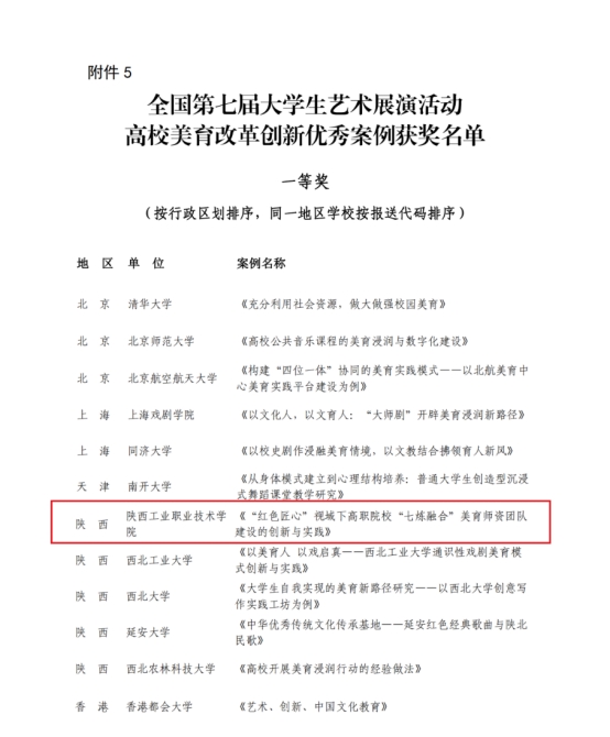 同日下午,美育改革创新案例报告会上,我校美育部部长付胜利以《“红色匠心”视域下高职院校“七炼融合”美育师资团队建设的创新与实践——以星空网页版登录入口为例》为题,从师德锤炼、课堂修炼、青蓝砺炼、研创淬炼、实践锻炼、内外合炼、机制熔炼七个方面展示了学校美育师资建设的成果,受到与会专家的充分肯定,获得高校美育改革创新优秀案例一等奖。近年来,我校重视美育师资团队建设,美育师资队伍2022年被评为陕西省第十届“陕西好集体”,并被《中国青年》杂志专版报道。