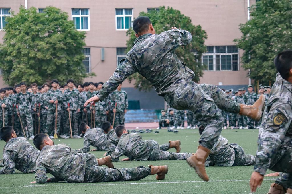 军训汇报暨总结表彰大会在雄壮的国歌声中拉开帷幕,鲜艳的五星红旗冉冉升起。随着校领导指示下达,军训汇报表演正式开始,全体受训学生军姿威严、队列整齐,以饱满的精神状态接受检阅。拳拳虎虎生风,招招势如破竹,军训科目汇报中参训学生们分别展示刺杀操、军体拳擒敌拳、匕首操、应急棍、战术表演等多个科目,一劈一扫,一挑一斩,迎风招展利剑出鞘,虎虎生威尽显工院学子飒爽风姿;豪情满怀,作战有术,干脆利落,一气呵成,气势恢弘的战队小组通过默契协作完成实战模拟任务,一招一式无不展现着坚毅果然的拼搏劲。
