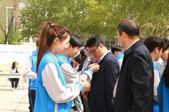 学生代表为到场嘉宾佩戴 “云帆生涯”徽章