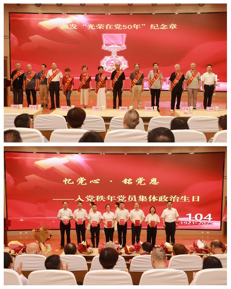 大会在朗诵《长征星火照前路 职教匠心立潮头》中拉开序幕。在“光荣在党50年”纪念章颁发仪式上,党委书记惠朝阳为老党员逐一佩戴纪念章。今年我校又有赵嘉骏等19名同志喜获“光荣在党50年”纪念章,作为学校的宝贵资源,老党员的精神品质必将激励年轻党员干部和青年学生坚定赓续光荣传统、传承精神谱系、接续爱国奋斗、开创美好未来的决心,让红色基因、革命薪火代代相传。不同党龄的党员代表也共同庆祝了入党秩年“政治生日”,校长刘永亮代表学校向他们送上最真挚的生日祝福。全体与会人员以热烈的掌声向在各个历史时期为学校的改革、建设和发展备尝甘苦、矢志不渝的老党员、老同志表示诚挚的谢意和崇高的敬意。