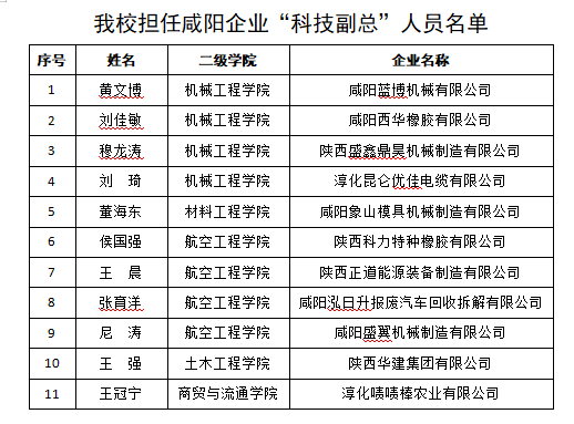 近日,中共咸阳市委组织部、市委科技工委印发《关于选派专家教授担任咸阳企业“科技副总”的通知》(咸科发〔2025〕21号),我校机械工程学院黄文博博士等11名科技工作者成功入选2025年咸阳市“科技副总”选派人员名单,将分别担任咸阳蓝博机械有限公司、咸阳西华橡胶有限公司等11家本地企业“科技副总”,助力企业破解技术研发、平台建设与人才培养等方面的难题。