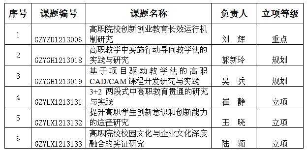 近日,依据中国高等职业技术教育研究会《关于下发中国高等职业技术教育研究会2012-2013年度课题立项的通知》(高职研【2013】17号)文件,我院申报的10项课题,经研究会学术委员会组织评审,有6项获准立项,其中重点课题1项,规划课题2项,立项课题3项。