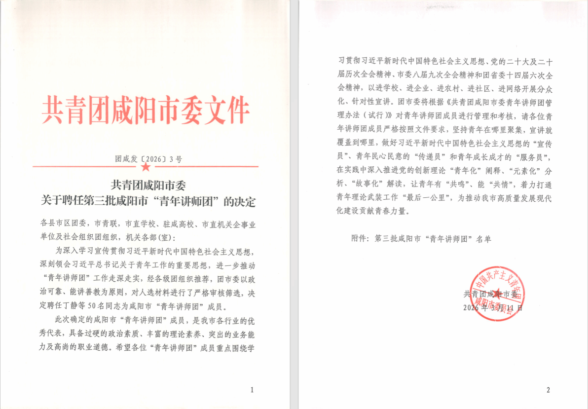 近日,共青团咸阳市委发布《关于聘任第三批咸阳市“青年讲师团”的决定》(团咸发〔2026〕3号),经过严格遴选,凭借过硬的政治素养、扎实的理论功底和丰富的宣讲经验,我校数智城市学院王珂、电气工程学院庞文瑶、汽车与智能工程学院常雪娇三名教师团干部入选“咸阳市青年讲师团”。