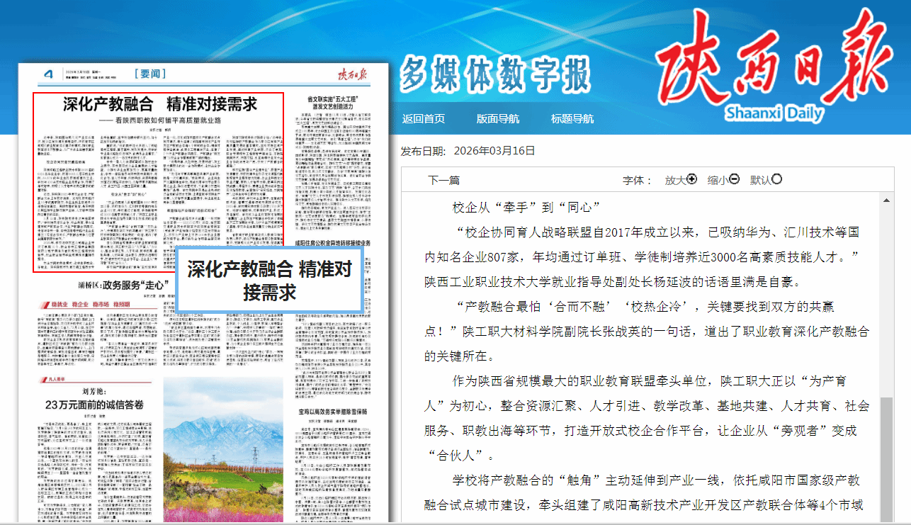 “产教融合最怕‘合而不融’‘校热企冷’,关键要找到双方的共赢点!”陕工职大材料学院副院长张战英的一句话,道出了职业教育深化产教融合的关键所在。