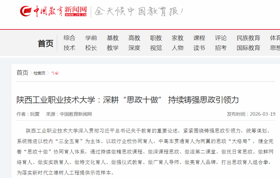 陕西工业职业技术大学深入贯彻习近平总书记关于教育的重要论述,紧紧围绕铸强思政引领力,统筹谋划、系统推进以校内“三全五育”为主体、以政行企校协同育人、中高本贯通育人为两翼的思政“大格局”,健全完善“思政十做”协同育人体系,通过持续做精思政课程、做深课程思政、做活第二课堂、做优日常思政、做鲜网络育人、做实实践育人、做特文化育人、做强仪式教育、做广育人导师、做亮育人品牌,打出思政育人组合拳,为落实新时代立德树人工程提供示范样本。
