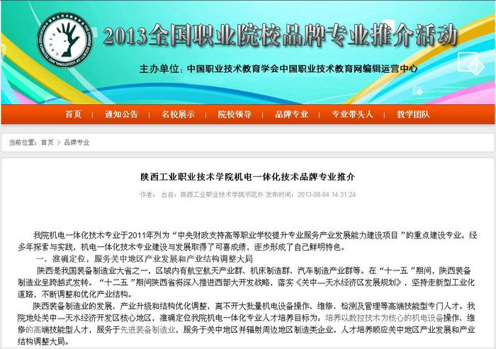 近期,中国职业技术教育学会面向全国职业院校征集职业院校品牌专业建设案例,经相关专家评审,我院电气自动化专业和机电一体化技术专业顺利入选,典型案例材料已展示在中国职业技术教育网“全国职业院校品牌专业推介活动”专栏。