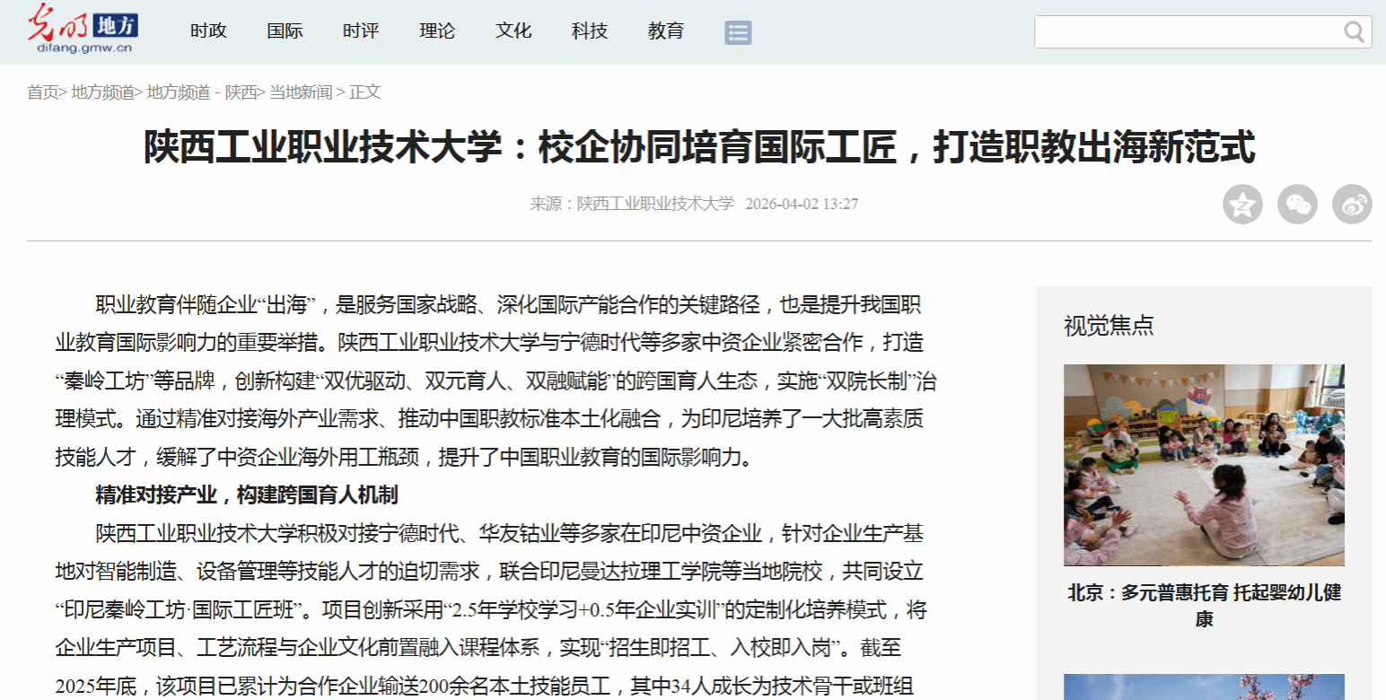 职业教育伴随企业“出海”,是服务国家战略、深化国际产能合作的关键路径,也是提升我国职业教育国际影响力的重要举措。陕西工业职业技术大学与宁德时代等多家中资企业紧密合作,打造“秦岭工坊”等品牌,创新构建“双优驱动、双元育人、双融赋能”的跨国育人生态,实施“双院长制”治理模式。通过精准对接海外产业需求、推动中国职教标准本土化融合,为印尼培养了一大批高素质技能人才,缓解了中资企业海外用工瓶颈,提升了中国职业教育的国际影响力。