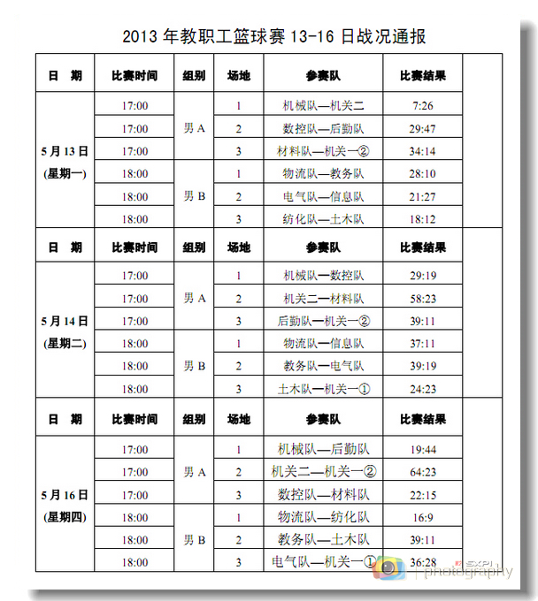 2013年教职工篮球赛由学院工会主办,教职工篮球协会承办,全院16个分会的21支代表队(13支男队,8支女队)约300名运动员将参与69场比赛的角逐。参赛队以全年的冠、亚军队为种子队,分为A、B两组进行第一阶段的小组单循环赛,决出的男子组前三名和女子组前两名再进行第二阶段的捉对厮杀,最终的男子组前6名和女子组前4名将予以奖励。
