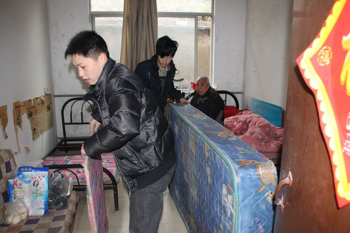 志愿者为老人整理床铺