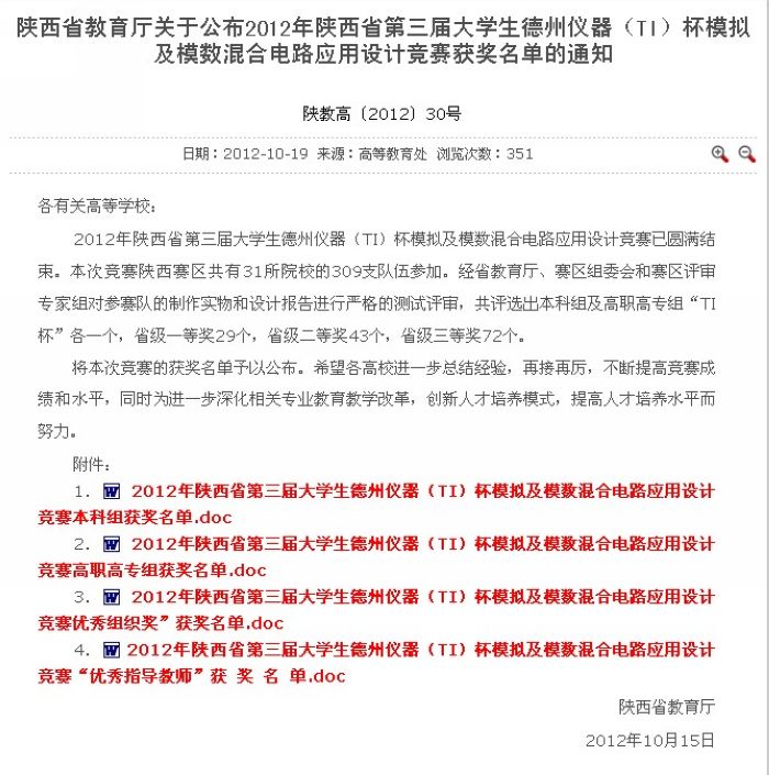 据悉,本次竞赛由陕西省教育厅主办,我省31所院校的309支队伍参赛,其中我院共派出6支代表队参赛,比赛内容为制作实物和设计报告。经省教育厅、赛区组委会和评审专家的严格评审,高职高专组共评选出“TI杯”一个,一等奖4个,二等奖5个,三等奖6个。