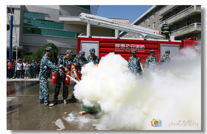 为确保此次消防演练活动顺利实施,学院制订了切实可行的活动方案,精心策划、周密部署。演练活动分为火灾逃生演练、灭火实战示范演练、灭火器材使用方法演练三个阶段。避险逃生演练开始,同学们用毛巾捂住口鼻、弯着腰,立即从至善园3号公寓撤离到指定地点。消防车赶来救援困在楼顶的学生,并迅速扑灭大火,救护车赶来现场救助受伤人员,整个过程有条不紊。随后,同学们在咸阳市公安消防支队渭城大队消防民警的指导下,学习灭火器的使用技巧,并进行了现场灭火演练。最后,咸阳市公安消防支队副支队长何永周同志对本次消防演练进行综合讲评。