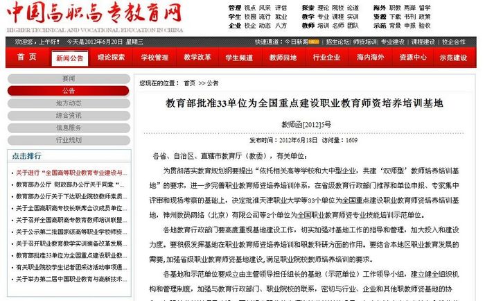 近日,教育部颁布教师函[2012]5号文件,批准33家单位为全国重点建设职业教育师资培养培训基地。我院被批准为全国重点建设职业教育师资培养培训基地,成为陕西省高职高专院校中获此殊荣的第一家,也是继西安交通大学、西北农林科技大学、陕西科技大学之后陕西省获批的第四家“国培基地”。