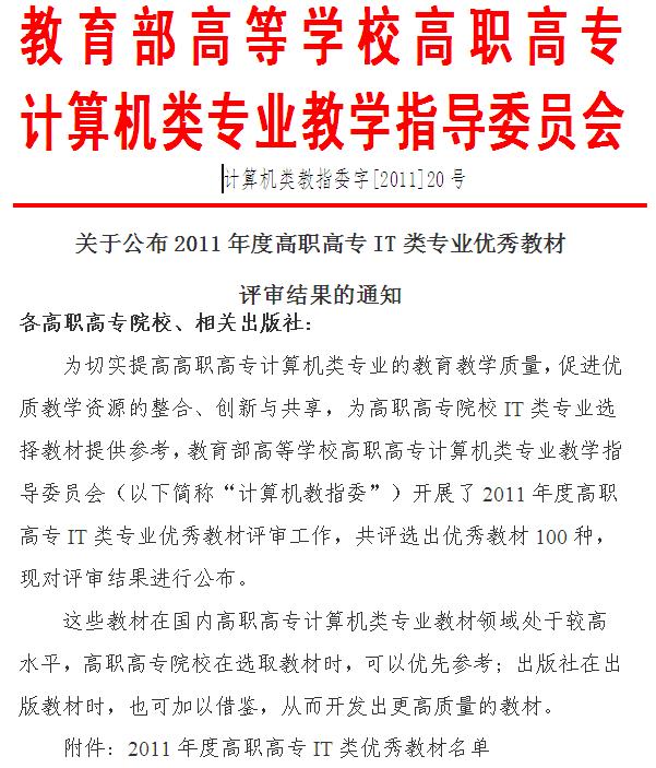 根据教育部高等学校高职高专计算机类专业教学指导委员会文件《关于公布2011年度高职高专IT类专业优秀教材评审结果的通知》 (计算机类教指委字[2011]20号)。由我院副院长王津教授主编的《计算机应用基础新编教程(第三版)》教材、信息工程学院董少明副教授主编的《单片机原理与应用(第二版)》和王坤副教授主编的《计算机组装与维护(第二版)》教材被评为“2011年度高职高专IT类优秀教材”。