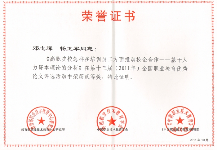 近日,在中国职业技术教育学会、教育部职业技术教育中心研究所和《中国职业技术教育》编辑部组织的第十三届(2011)全国职业教育优秀论文评选活动中,我院共有8篇教育教学类论文获奖,其中邓志辉、杨卫军撰写的《高职院校怎样在培训员工方面推动校企合作》,张普礼、王晓江、梁熠葆撰写的《高职院校校外实习基地建设与管理的探索与实践》获优秀论文二等奖;陈玉祥撰写的《体育教学中的多媒体技术运用》、付胜利撰写的《基于职业教育的美育课程改革研究与实践》获优秀论文三等奖;王晓梅等撰写的其他四篇论文获优秀奖;同时,学院还获得了优秀组织奖。