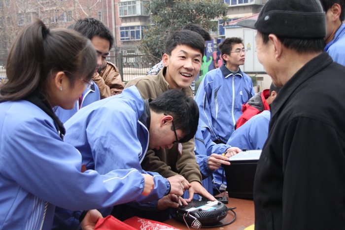 12月3日,陕西工院社区同乐园的活动现场,电器维修协会的志愿者们冒着凛冽的寒风为社区居民义务维修小家电。他们认真、专业的精神得到了社区居民的交口称赞。71岁退休在家的白老师看着被修好的孙子的电动玩具车,高兴地竖起了大拇指。此外,大学生志愿者还通过散发传单向社区群众进行了冬季防火防盗防流感的宣传活动。另一志愿者小分队则带着自编自演的小节目奔赴夕阳红敬老院,为那里的孤寡老人送去融融暖意。