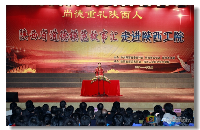 省曲艺家协会原副主席刘文龙、副秘书长李晓春和学院领导崔岩、李顺利、王天哲、赵嘉骏,中心组成员,各部门、二级学院负责人和师生员工约1200人一同观看演出。党委副书记王天哲在演出开始前致辞。他指出,我院历来重视精神文明建设工作,持续深入地开展群众性文明创建和道德建设活动,先后荣获“全国机械行业文明单位”、“全国学校艺术教育先进单位”和“陕西省平安校园”等称号。他希望通过本次活动,引领全院师生自觉以先进典型为榜样,从我做起、从现在做起、从身边小事做起,打造品牌专业、造就教学名师、培养高素质学生,为民族振兴培育新时期装备制造业和纺织服装业生产、建设、管理、服务一线需要的高素质技能型专门人才。