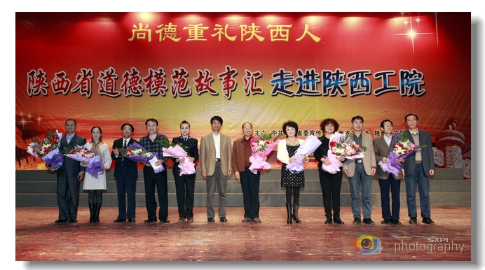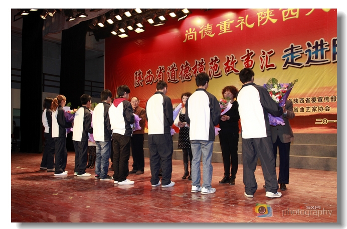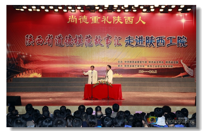 省曲艺家协会原副主席刘文龙、副秘书长李晓春和学院领导崔岩、李顺利、王天哲、赵嘉骏,中心组成员,各部门、二级学院负责人和师生员工约1200人一同观看演出。党委副书记王天哲在演出开始前致辞。他指出,我院历来重视精神文明建设工作,持续深入地开展群众性文明创建和道德建设活动,先后荣获“全国机械行业文明单位”、“全国学校艺术教育先进单位”和“陕西省平安校园”等称号。他希望通过本次活动,引领全院师生自觉以先进典型为榜样,从我做起、从现在做起、从身边小事做起,打造品牌专业、造就教学名师、培养高素质学生,为民族振兴培育新时期装备制造业和纺织服装业生产、建设、管理、服务一线需要的高素质技能型专门人才。