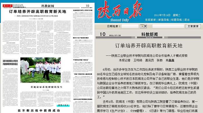 7月19日,《陕西日报》在第10版以《订单培养开辟高职教育新天地——星空网页版登录入口与欧姆龙公司合作培养人才模式探索》为题报道我院校企合作、订单培养的办学实践,先后被《中国教育星空(中国)网》、《当代陕西网》等多个主流媒体转载,在社会和行业引起了极大关注。