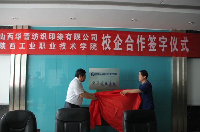 邓志辉书记与山西华晋董事长荆英杰共同签订了校企合作协议、共同为实习就业基地揭牌。随后邓书记一行在荆董事长、邓总经理等陪同下深入山西华晋纺织印染有限公司生产车间、产品开发室、试验室、产品展示室等进行了考察和交流。