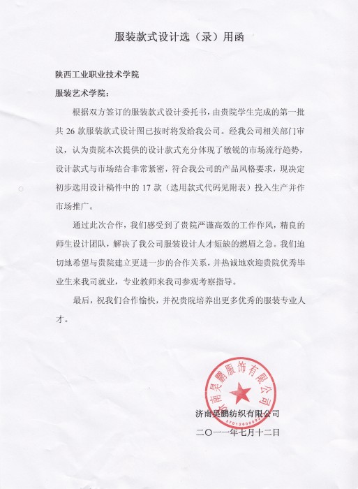 “陕西工院服装艺术学院:由贵院学生完成的第一批共26款服装款式设计图,经我公司相关部门审议,决定初步选用其中的17款,投入生产并做市场推广”。日前,一封来自济南昊鹏服饰有限公司的“服装款式设计选(录)用函”,让服装艺术学院的师生体会到了在校企合作平台上开展服装设计“实战训练”成功后的喜悦和激动。