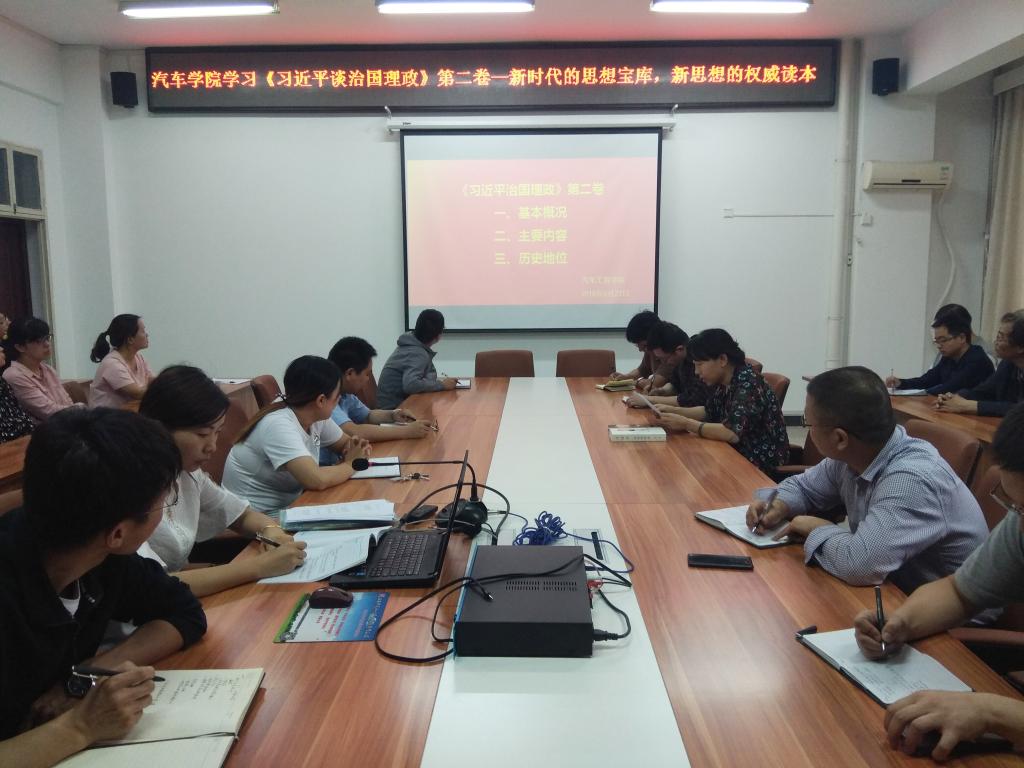 5月23日下午,汽车工程学院举行专题学习会,集中学习《习近平谈治国理政》第二卷。汽车学院党总支书记高亚宁主持会议并领学,全体党员参加学习。