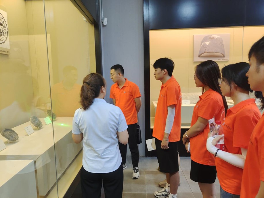 图上为工作人员在向实践团队员耐心讲解双鱼铜镜背后刻画的故事