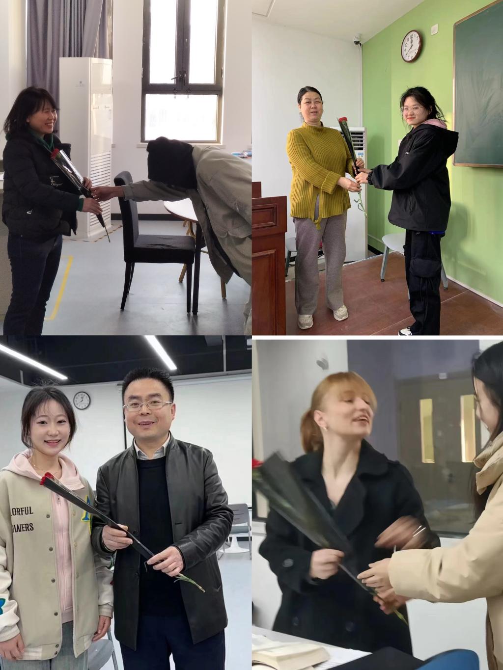 鲜花送给“TA”。在“三八”妇女节当天,学生们为上课教师送上鲜花,表达着对授课教师的感谢与祝福。一朵朵芬芳的鲜花,一句句温馨的话语,传达着对老师们的尊敬与爱护,传达着幸福与温暖。