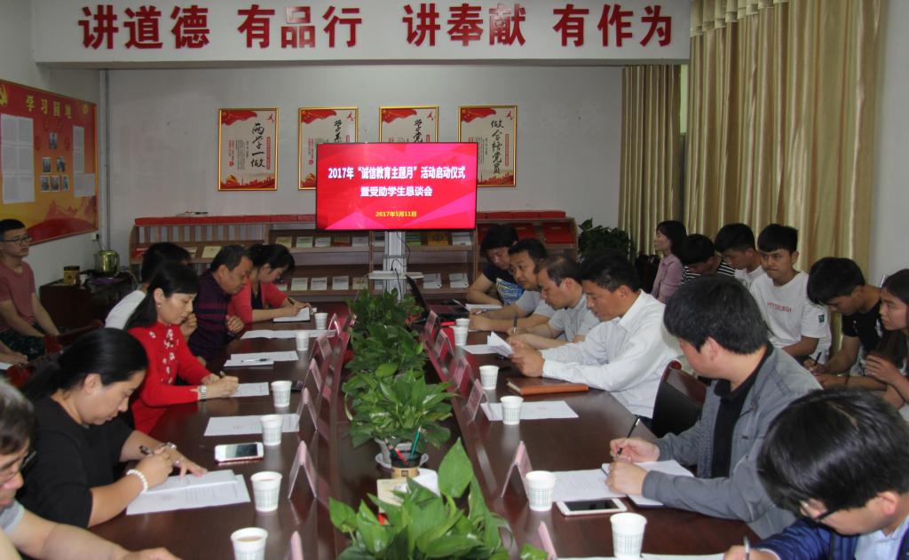 5月11日下午,2017年诚信教育主题月启动仪式暨受助学生恳谈会,在至善园学生党员活动室举行。学工部部长、学生处处长王超联,学生处副处长张翔,各二级学院学工办主任、辅导员代表、学生资助管理中心工作人员及30余名学生代表参加了会议。学生处副处长张翔主持会议。