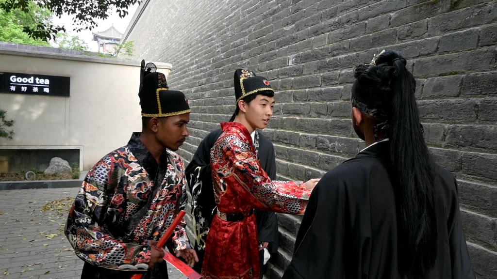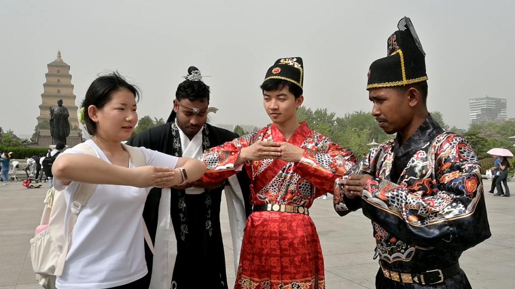 中华优秀传统文化源远流长。我们来到了大雁塔,"中国有礼仪之大,故称夏;有服章之美,谓之华。"团队成员为留学生教授讲解古代礼仪,留学生认真学陕西话“么麻达”。